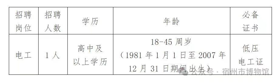 宿州市博物馆委托安徽河川人力资源有限公司面向社会公开招聘专职电工1名。